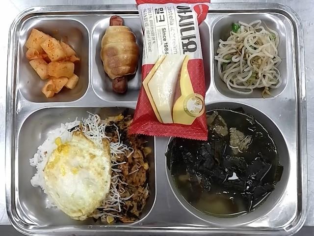 석식: 참치김치덮밥, 쇠고기미역국, 숙주나물, 깍두기, 미니패스츄리핫도그, 아이스크림