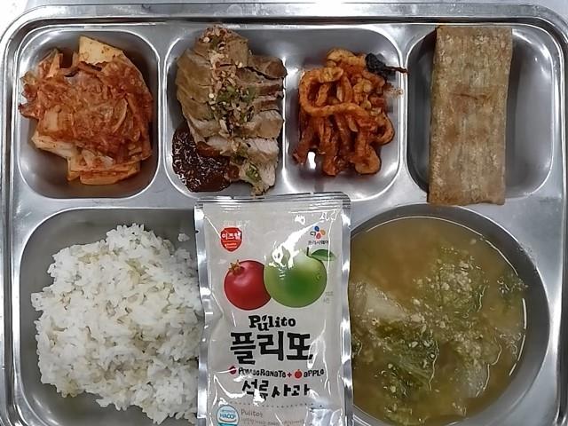 중식: 찰보리밥, 콩가루배추국, 수육+새우젓, 메밀김치전병, 매실무말랭이양념무침, 보쌈김치, 석류사과