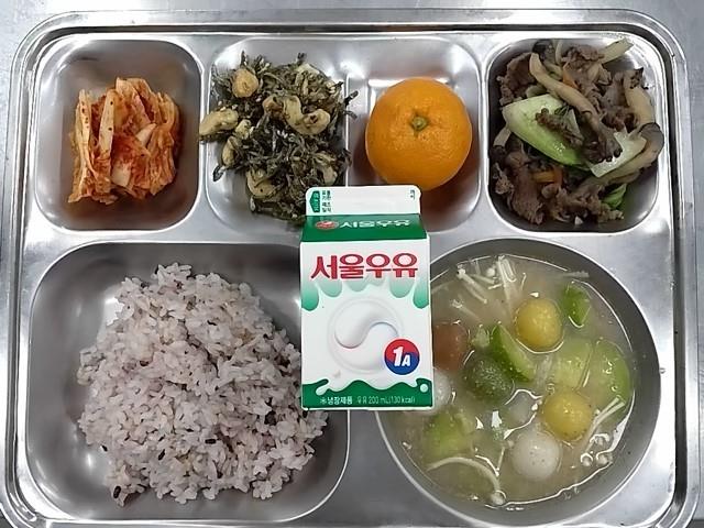 조식: 혼합잡곡밥, 들깨감자옹심이국, 소불고기청경채볶음, 캐슈넛멸치볶음, 배추김치 귤,우유