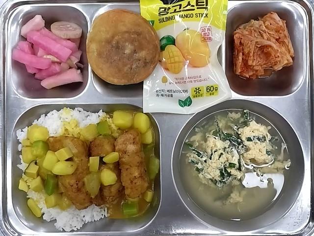 석식: 돈까스카레덮밥, 부추계란국, 삼색모듬피클, 배추김치, 수제씨앗호떡, 아이스망고