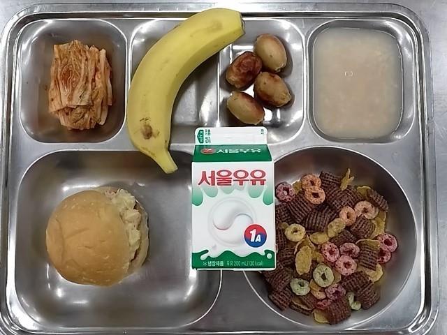 조식: 참치샌드위치, 시리얼+우유, 소시지, 바나나, 숭늉, 배추김치