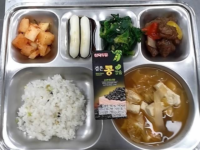 조식: 서리태밥, 둔부김치국, 딥브라운찹스테이크, 시금치나물, 치즈가래떡, 깍두기, 검은콩두유