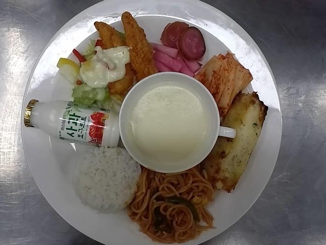 중식: 미트소스스파게티, 백미밥, 크림스프, 마늘빵, 치킨샐러드, 모듬피클, 요구르트, 배추김치
