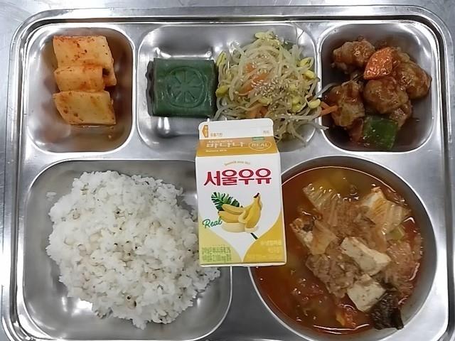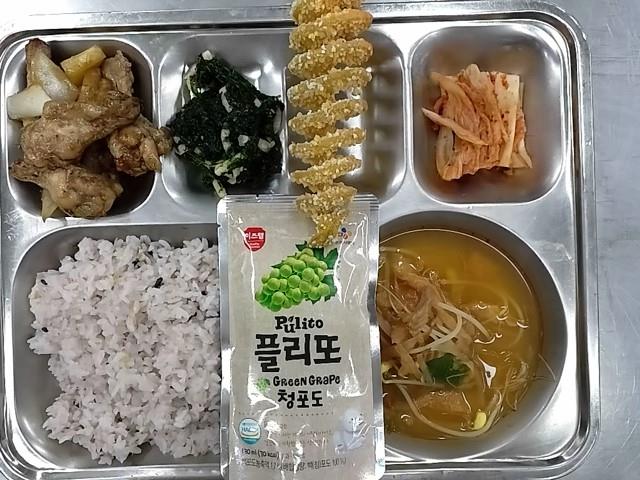 석식: 혼합잡곡밥, 북어채콩나물국, 닭봉데리야끼소스조림, 파래무침, 눈꽃뱅뱅이감자, 배추김치, 포도쥬스