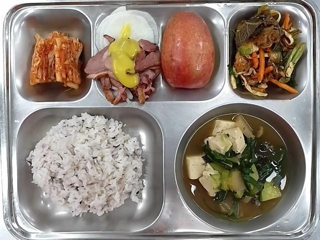 중식: 혼합잛곡밥, 우렁된장찌개, 오리훈제+소스, 꼬막야채무침, 무쌈, 배추김치, 친환경사과