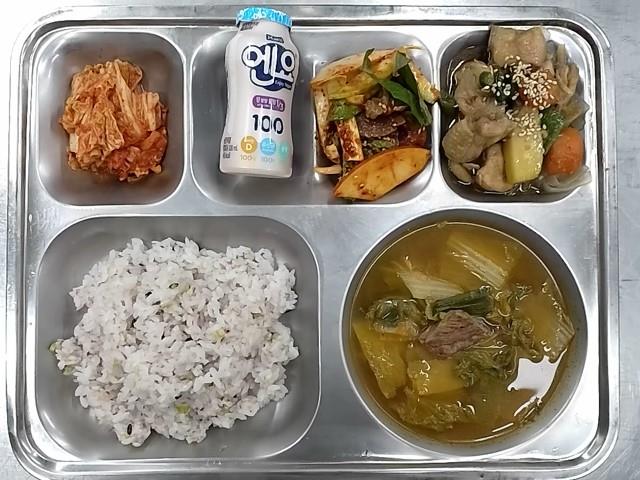 중식: 혼합잡곡밥, 사골우거지국, 안동찜닭, 골뱅이무침, 배추김치, 앤요요구르트