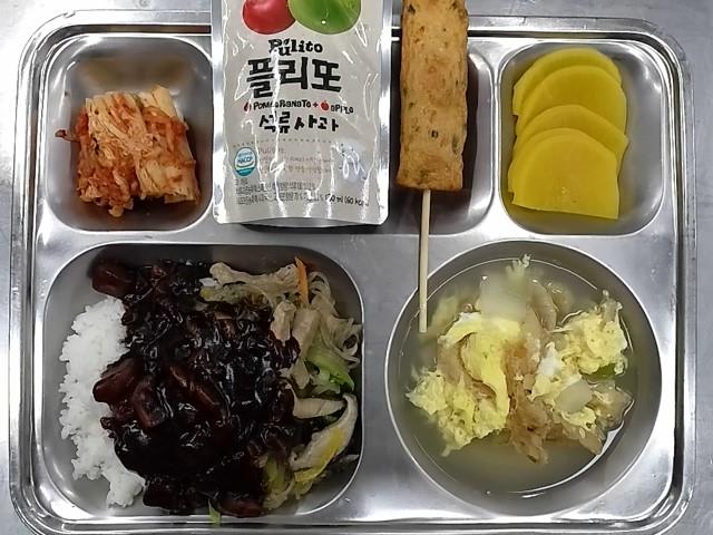 석식: 밥채덮밥+자장소스, 북어무국, 매콤오징어어묵바, 단무지무침, 배추김치, 석류사과주스