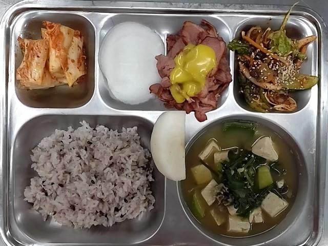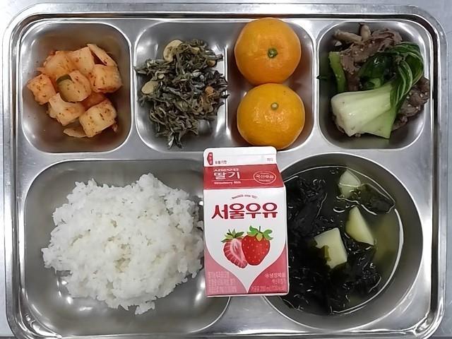조식: 백미밥, 감자미역국, 소불고기청경채볶음, 캐슈넛멸치볶음, 깍두기, 귤, 딸기우유