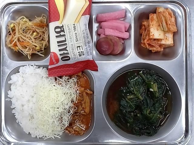 석식: 눈꽃치즈제육덮밥, 시금치된장국, 콩나물무침, 배추김치, 오미자피클, 아이스크림