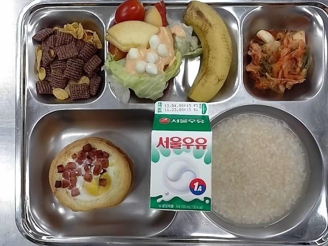 조식: 메이플에그인홀토스트, 사과양상추샐러드, 시리얼+우유, 바나나, 숭늉, 배추김치