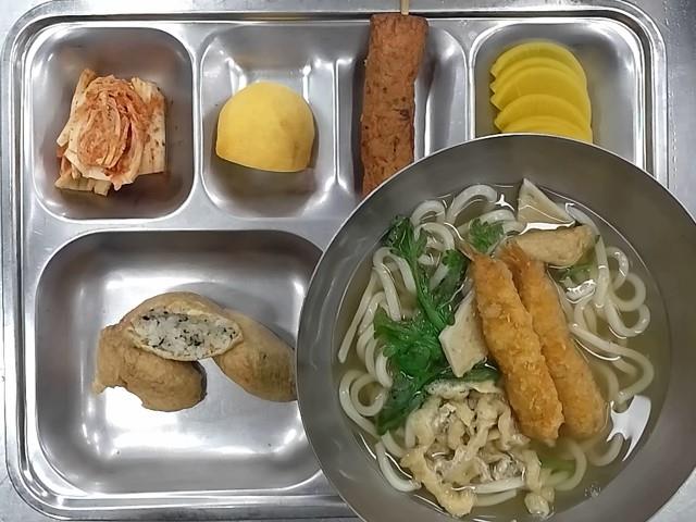 중식: 새우튀김우동, 유부초밥, 매콤오징어어묵바, 단무지, 배추김치, 단감