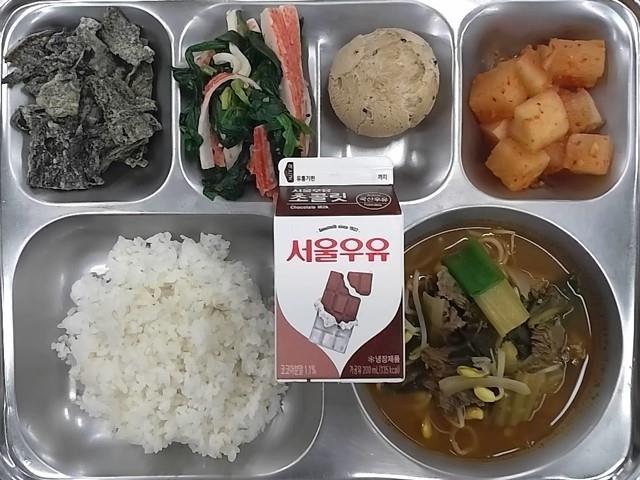 조식: 현미찹쌀밥, 쇠고기해장국, 시금치맛살무침, 김부각, 깍두기, 깨찰빵, 초코우유