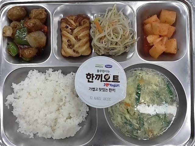 조식: 백미밥, 대게살스프, 함박소스새싹미트볼, 숙주나물, 깍두기, 메이플피칸, 요거트