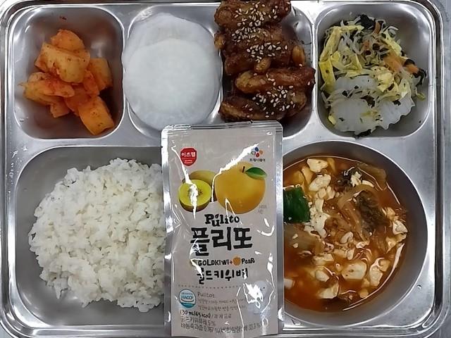 중식: 현미찹쌀밥, 순두부찌개, 등갈비데리야끼소스조림, 청포묵김가루무침,무쌈, 깍두기, 골드키위배