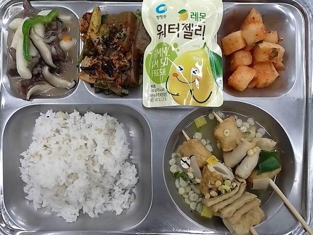 석식: 찰보리밥, 꼬치어묵국, 궁중떡볶이, 도토리묵김치조림, 깍두기, 워터젤리