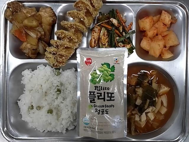 석식: 완두콩밥, 두부김치국, 닭봉데리야끼소스조림, 양배추부추무침, 눈꽃뱅뱅이감자, 배추김치, 포도주스