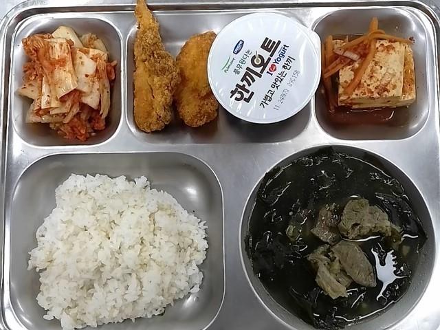 조식: 현미찹쌀밥, 쇠고기미역국, 두부조림, 케이준통살치킨텐더, 배추김치, 요거트