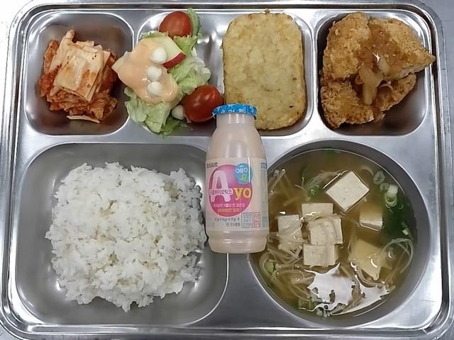중식: 현미찹쌀밥, 미소된장국, 등심치즈돈까스, 사과양상추샐러드, 해쉬브라운, 배추김치, 요구르트