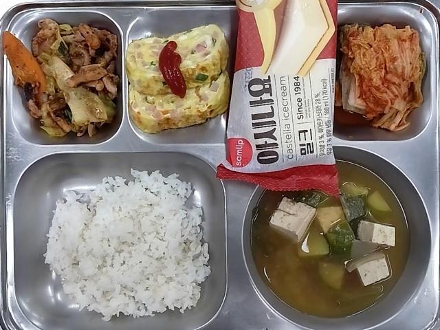석식: 현미찹쌀밥, 두부된장찌개, 주꾸미볶음, 햄계란말이, 배추김치, 아이스크림