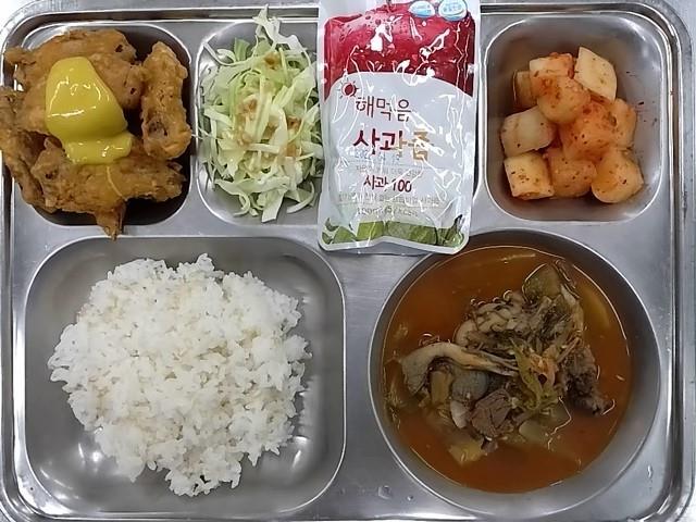 중식: 현미찹쌀밥, 육개장, 닭날개튀김+소스, 양배추샐러드, 깍두기, 친환경사과주스