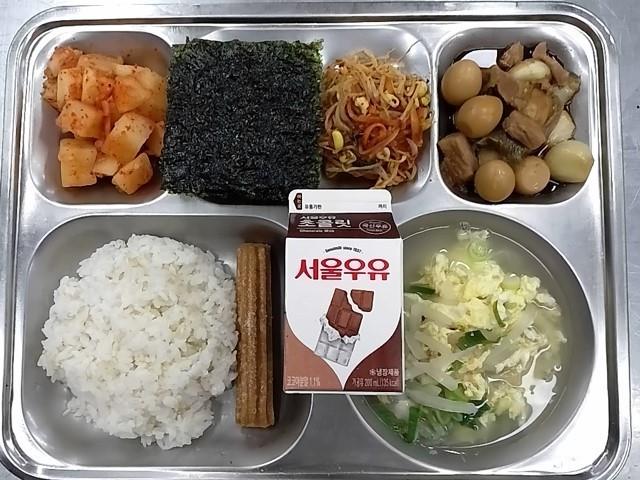 조식: 현미찹쌀밥, 북어채계란국, 메추리알돈육장조림, 콩나물무침, 구이김,우리쌀추로스, 초코우유