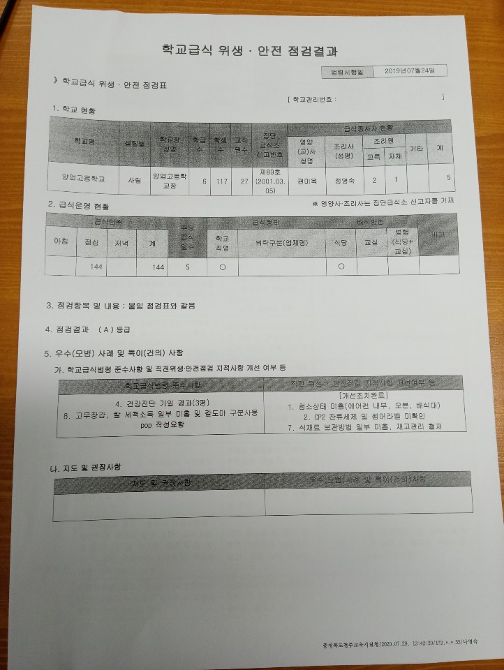 2020학년도 상반기 학교급식 위생.안전 점검 결과를 알려드립니다.