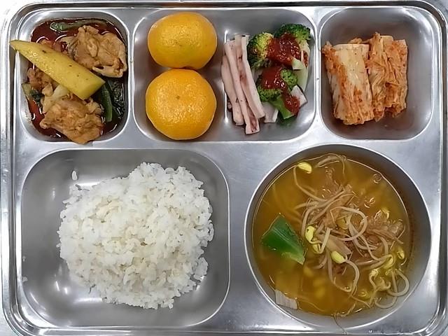 중식: 현미찹쌀밥, 북어채콩나물국, 닭갈비, 오징어브로콜리숙회, 배추김치, 귤