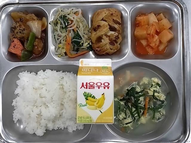 조식: 백미밥, 대게살스프, 함박소스새싹미트볼, 숙주나물, 깍두기, 메이플피칸, 바나나우유