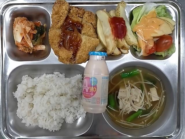 중식: 현미찹쌀밥, 미소된장국, 등심치즈돈까스, 반달감자, 사과양상추샐러드, 배추김치, 요구르트