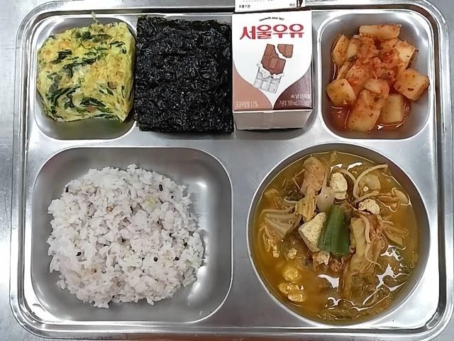 조식: 혼합잡곡밥, 부대찌개, 시금치계란말이, 구이김, 깍두기, 쵸코우유
