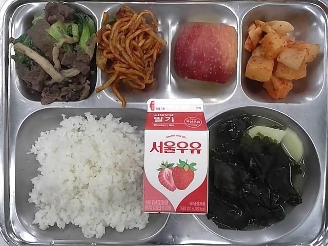 조식: 백미밥ㄴ, 감자미역국, 소불고기청경채볶음, 진미채볶음, 깍두기, 사과, 딸기우유