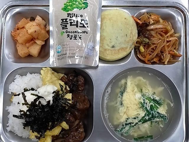 석식: 떡갈비마요덮밥, 계란부추국, 쫄면콩나물무침, 깍두기, 바싹씨앗호떡, 청포도주스