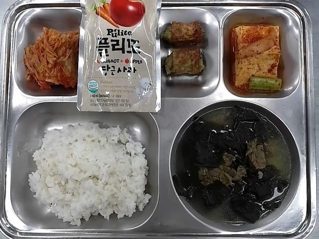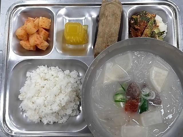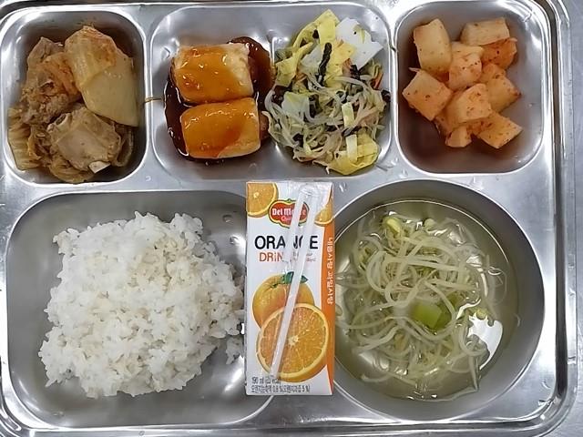 석식: 현미찹쌀밥, 콩나물국, 등갈비김치조림, 청포묵김가루무침, 빙빙소떡꼬치, 깍두기, 오렌지주스