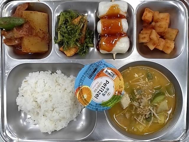 석식: 현미찹쌀밥, 청국장찌개, 삼치조림, 치커리사과무침, 빙빙소떡꼬치, 깍두기, 쁘띠첼