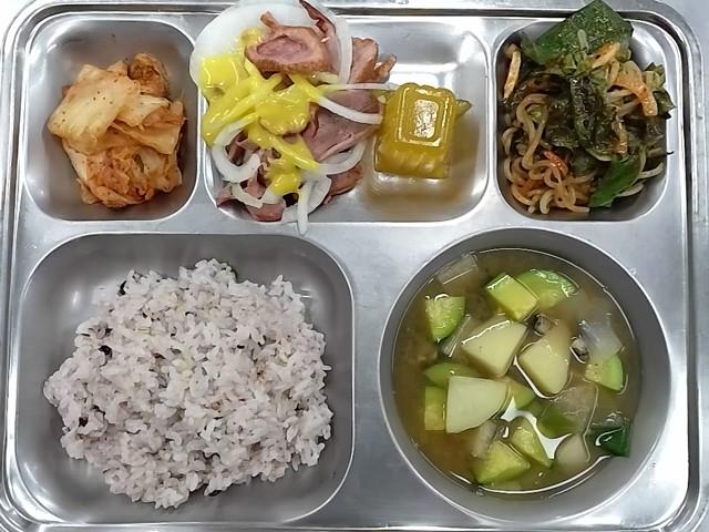 중식: 혼합잡곡밥, 우렁된장찌개, 오리훈제+소스, 쫄면야채무침, 무쌈, 배추김치, 애플망고푸딩