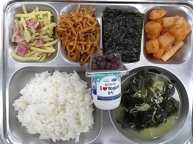 조식: 현미찹쌀밥, 닭고기미역국, 감자채베이컨볶음, 진미채볶음, 구이김, 깍두기, 요거트토핑