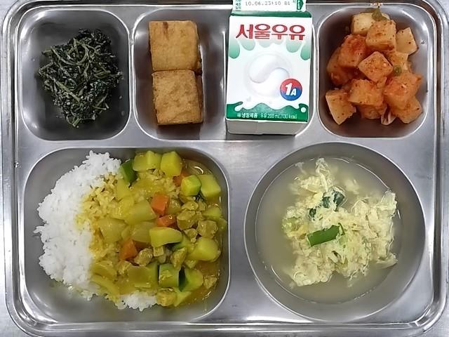 조식: 카레라이스, 달걀파국, 새우가득멘보샤, 깻잎나물, 깍두기, 우유