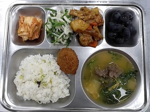 중식: 서리태밥, 사골우거지국, 닭봉바비큐소스조림, 양파부추무침, 고추잡채크로케타, 배추김치, 포도