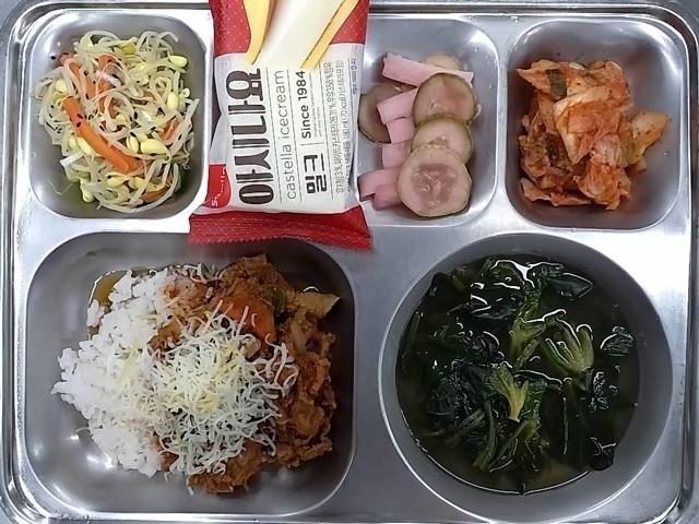 석식: 눈꽃치즈제육덮밥, 시금치된장국, 콩나물무침, 배추김치, 오미자믹스피클, 아이스크림