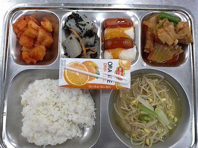 석식: 현미찹쌀밥, 콩나물국, 등갈비김치조림, 청포묵무침, 소떡소떡, 깍두기, 오렌지쥬스