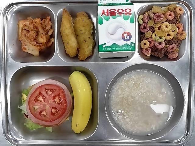 조식: 동글빵몬테크리스토, 치킨텐더, 시리얼+우유, 바나나, 숭늉, 배추김치,