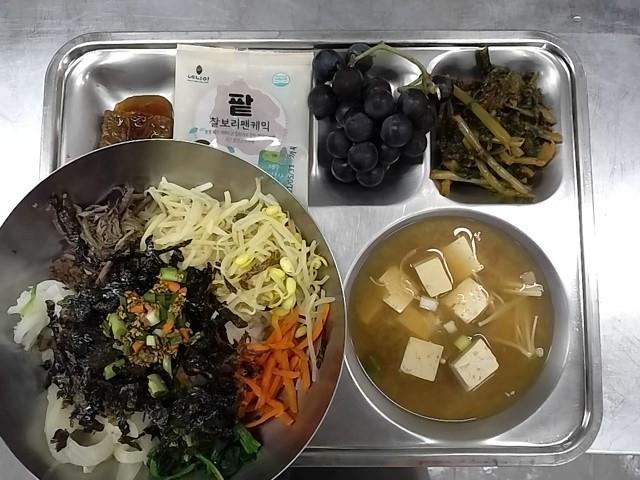 중식: 안동비빔밥+간장양념, 미소된장국, 송정식떡갈비, 열무김치, 찰보리팬케익, 친환경포도