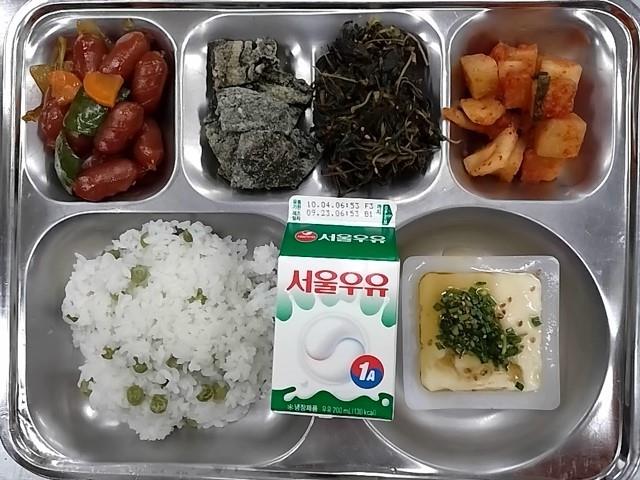 조식: 완두콩밥, 연두부+양념장, 비엔나야채볶음, 고춧잎나물, 김부각, 우유