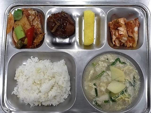 중식: 찰옥수수밥, 감자수제비국, 주먹떡갈비, 갈치무조림, 배추김치, 골드파인애플