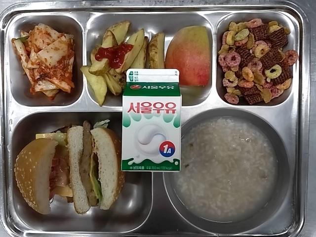 조식: 스테이크치즈버거, 반달감자, 시리얼+우유, 사과, 숭늉, 배추김치