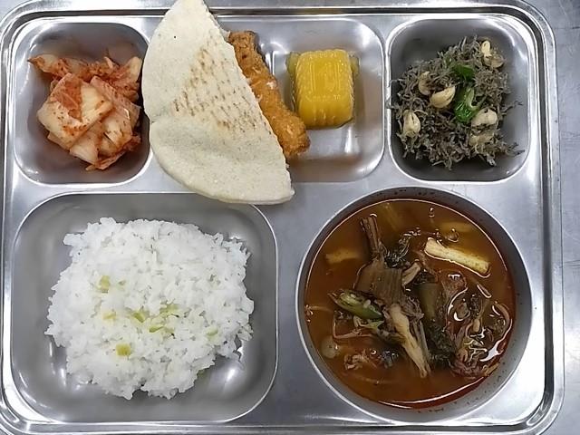 중식: 서리태밥, 육개장, 치킨피타브래드, 캐슈넛멸치볶음, 배추김치, 자몽푸딩