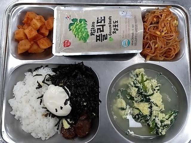 석식: 떡갈비마요덮밥, 계란부추국, 쫄면콩나물무침, 깍두기, 청포도주스