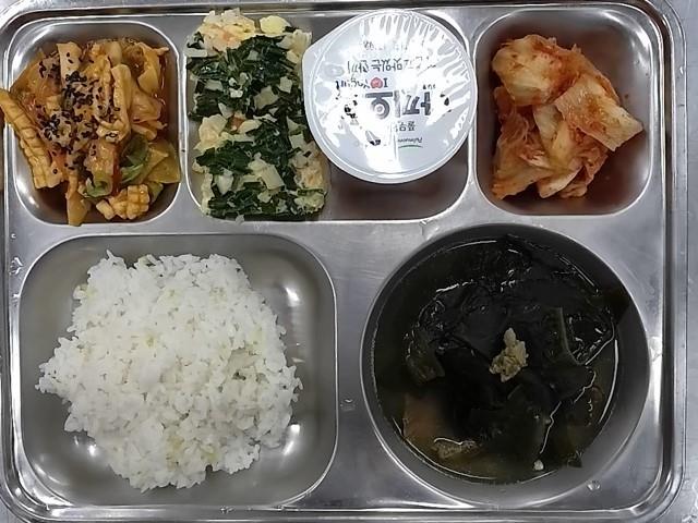 조식: 서리태밥, 쇠고기미역국, 맛살계란찜, 오징어볶음, 배추김치, 아이러브요거트