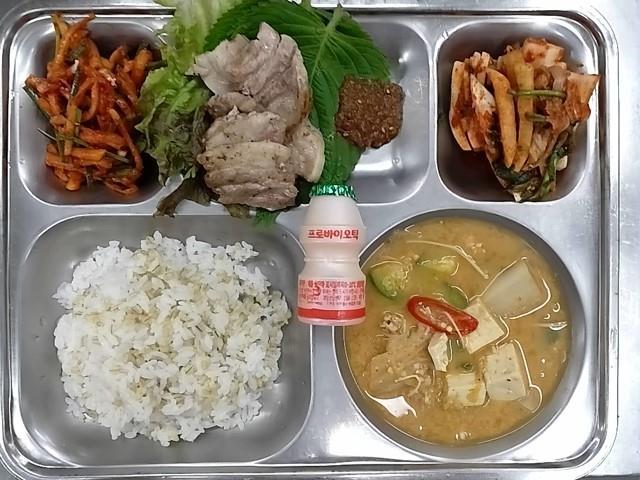 중식: 찰보리밥, 청국장찌개, 돈삼겹,목살구이, 부추무생채, 보쌈김치, 상추,깻잎+쌈장, 요구르트