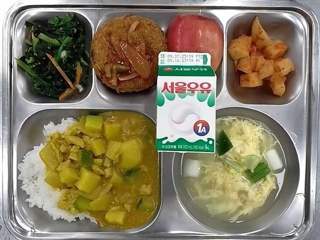 조식: 카레라이스, 달걀파국, 새우까스+소스, 시금치나물, 깍두기, 우유